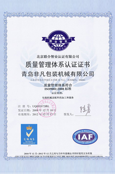 祝賀青島非凡包裝機(jī)械有限公司順利通過(guò)ISO9001質(zhì)量體系認(rèn)證